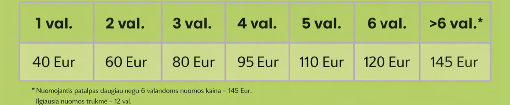 Surašytos kainos yra taikomos trumpalaikei, vienkartinei nuomai. Dėl daugkartinės arba pastovios nuomos detalės yra derinamos individualiai.